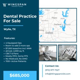 General Dental Practice – Wylie, Texas – FOR SALE – $685,000 – Located just 30 minutes northeast of Dallas in a growing area...