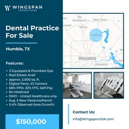 General Dental Practice Humble, Texas FOR SALE $150,000 – Real Estate is available in addition to the practice for $250,000, stand alone...