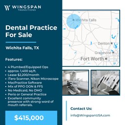 Periodontal Dental Practice – Wichita Falls, TX — FOR SALE $415,000 Established periodontal specialty practice in Wichita Falls with the...