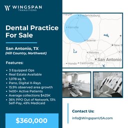 General Dental Practice – San Antonio (Hill Country/Northwest Area) FOR SALE $360,000 Well-established general dental practice located in...