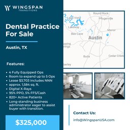 General Dental Practice – Austin, TX – FOR SALE – $325,000 - This dental office opportunity is tucked into one of the most dynamic...