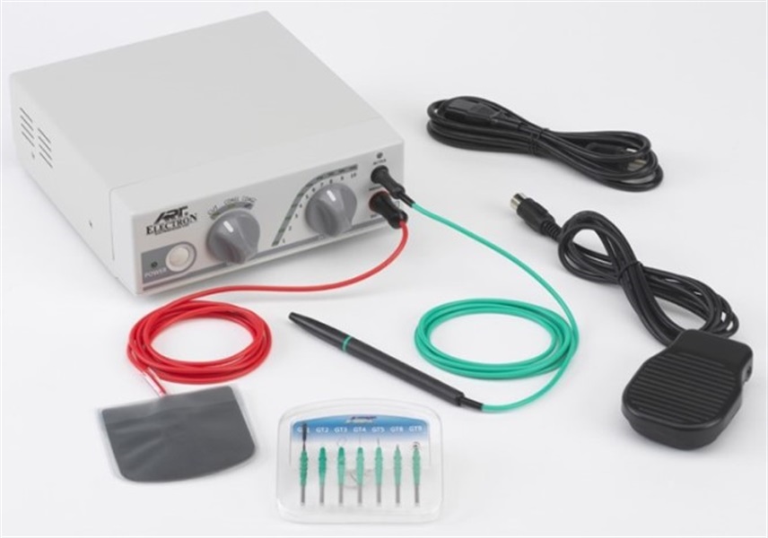 comes with 7 Titanium Electrodes, 1 hand piece, 1 indifferent plate, 1 power cord, AND 1 foot switch.