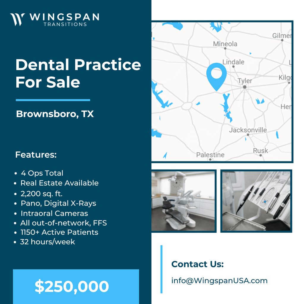 General Dental Practice Brownsboro, Texas FOR SALE $250,000 – Real Estate is available in addition to the practice for $375,000, stand alone, office is approx. 2,200 sq ft, 4 ops equipped. Practice has been established for over 30 years. The office is presently open about 32 hours/week and using Eaglesoft. Technology includes: Pano, digital x-rays, and Intraoral Cameras; all equipment is in great condition. Patient base all out of network, no insurance contracts, no Medicaid, no DMO with 1150+ active patients. Interested in learning more? Our sellers require a signed NDA before we can share practice details. To get started, simply complete a Buyer Form and NDA at wingspantransitions.com/buyer-form. This only needs to be done once every six months. If you’ve already completed this within that timeframe, just email info@WingspanUSA.com or text us with your name and the listing you're interested in — we’ll verify your profile and NDA are active and send the details your way. Our goal is to respond within one business day. Listing 1031-AN