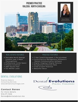 Enhanced Performance at a more Attractive Price Point in Raleigh, NC! It is a profitable and growing practice in a premier North Raleigh community near the Wake Med North medical complex, high visibility from 2 major thoroughfares, surrounded by affluent neighborhoods, retail shopping, and restaurants in the area. The spacious professional condo is 2857 sq ft with 5 fully equipped treatment rooms, two more pre-plumbed, High-Tech, beautiful cabinetry, professionally decorated, and in pristine condition.  There is great potential for untapped growth by having a consistent doctor presence, additional procedures, and marketing efforts in the area.  Don’t miss this opportunity to make this practice your legacy!  Below is a “snapshot” illustration of the practice.  Please contact Renee Pfefferle if interested or you have a colleague interested at 919-271-1506 or email renee@dentaladvisor.me.