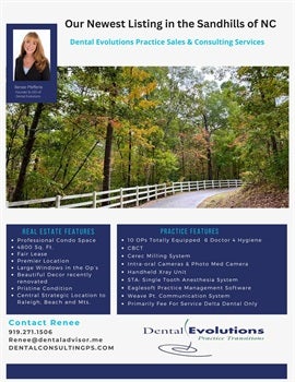 It is a well-established practice, primarily Fee for Service, highly skilled staff, and in a prime location.  The exceptional facility is 4800 sq ft with a reasonable lease and recent renovations with beautiful décor, 10 treatment rooms, large picture windows, and is on a corner lot visible from a heavily traveled thoroughfare.  The doctor started the practice and has dedicated 33 years of service to his patients with an excellent reputation in the community. He is willing to assist with the transition phase and pass on Goodwill to a new owner. Don’t miss this opportunity for new ownership or partnership with another doctor. Below is a “snapshot” illustration of the practice.  We look forward to sharing the practice attributes and amazing offer! Please contact Renee Pfefferle if interested or you have a colleague who is interested at 919-271-1506 or email renee@dentaladvisor.me .