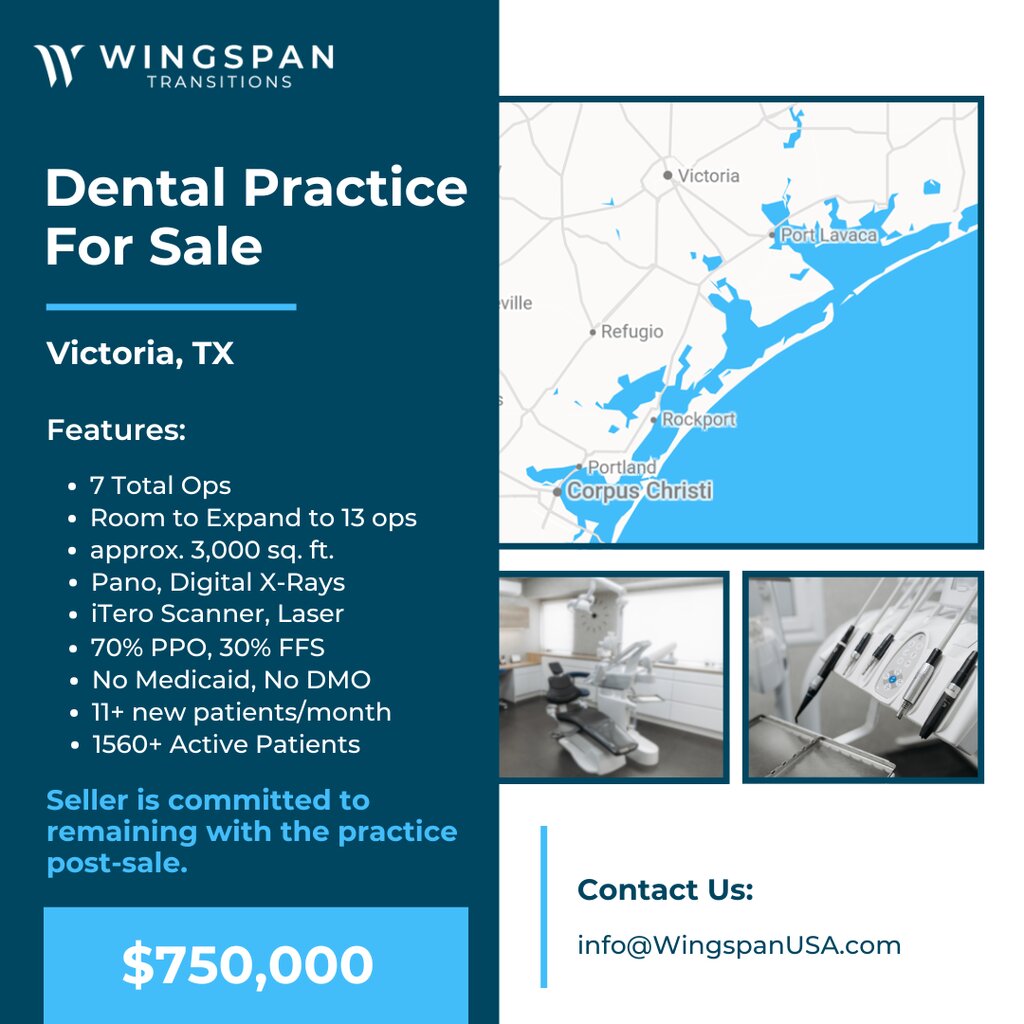 General Dental Practice – Victoria, Texas – FOR SALE – $750,000 – Real estate available in addition to the practice for $1,015,000. Established 17 years, 3,000 sq. ft. facility features 7 total plumbed operatories (room to expand about 6 more ops). Seller is committed to remaining with the practice post-sale. Technology includes Pano, digital X-rays, iTero scanner, laser and Eaglesoft. The payer mix is 70% PPO, 30% FFS/Self Pay; no Medicaid, no DMO. New patients average 11+/month, with over 1560+active patients. Interested in learning more? Our sellers require a signed NDA before we can share practice details. To get started, simply complete a Buyer Form and NDA at wingspantransitions.com/buyer-form. This only needs to be done once every six months. If you’ve already completed this within that timeframe, just email info@WingspanUSA.com or text us with your name and the listing you’re interested in — we’ll verify your profile and NDA are active and send the details your way. Our goal is to respond within one business day. Listing 1035-AN
