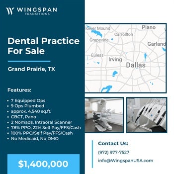 General Dental Practice Grand Prairie, Texas FOR SALE $1,400,000 – Practice has been established for over 25 years with 9 total plumbed ops, 7 of which are equipped in a 4,540 sq. ft. $6500 leased space. The office is presently open about 32-40 hours/week and using Eaglesoft. Technology includes: CBCT, Pano, digital x-rays, 2 Nomads, Intraoral Scanner by Dandy, and Intraoral Cameras; all equipment is in great condition. Patient base about 78% PPO, 22% FFS/Self-Pay, no Medicaid, no DMO with 1730+ active patients and about 20+ new patients/month. Our sellers require a signed NDA before we can share practice details. To get started, simply complete a Buyer Form and NDA at wingspantransitions.com/buyer-form. This only needs to be done once every six months. If you’ve already completed this within that timeframe, just email info@WingspanUSA.com or text us with your name and the listing you're interested in — we’ll verify your profile and NDA are active and send the details your way. Our goal is to respond within one business day. (Listing 1046-SC)