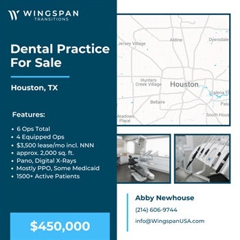 General Dental Practice – Houston, Texas – FOR SALE – $450,000 - Established for 12 years, this general practice features 6 total ops, with 4 fully equipped ops, plus room to build out and add on to the 6 ops. The 2,000 sq. ft. office is located in a beautiful complex with other healthcare businesses along with strong visibility and surrounded by residential neighborhoods. Lease is $3,500/month, including NNN. This well-maintained practice includes Pano, Digital X-rays, Intraoral camera, and Open Dental software. The patient base is PPO and Medicaid with some FFS/Self-Pay and over 1,500+ active patients in the past 24 months. Our sellers require us to have an NDA on file for anyone we share their info with---thanks in advance! Send an email to info@WingspanUSA.com or text Abby Newhouse at 214.606.9744 with your first and last name, as well as your email to request an NDA. For more info check out our website www.WingspanUSA.com. (Listing 1008-AN)
