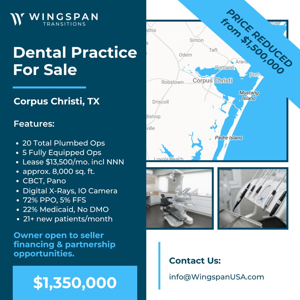 General Dental Practice – Corpus Christi, Texas – FOR SALE – $1,350,000 – SELLER FINANCING AVAILABLE! PRICE REDUCED from $1.5M. Owner is open to partnership opportunities. Established 9 years, 8,000 sq. ft. facility features 20 total plumbed operatories (5 fully equipped). Technology includes CBCT, Pano, digital X-rays, intraoral camera, and Dentrix software. The lease is $13,500/month including NNN. The payer mix is 72% PPO, 5% FFS, 22% Medicaid, no DMO. New patients average 21+/month, with over 1100 active patients. Our sellers require a signed NDA before we can share practice details. To get started, simply complete a Buyer Form and NDA at wingspantransitions.com/buyer-form. This only needs to be done once every six months. If you’ve already completed this within that timeframe, just email info@WingspanUSA.com or text us at (972) 977-7527 with your name and the listing you’re interested in — we’ll verify your profile and NDA are active and send the details your way. Our goal is to respond within one business day.  (Listing 1057-SLO)