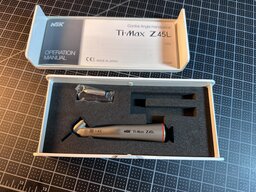 Genuine NSK Ti-Max Z45L – the world’s first 45° angled electric contra-angle for superior posterior access (third-molar extractions, sectioning, impacted teeth). 1:4.2 increasing ratio (up to 168,000 RPM), fiber optic, titanium body, quattro spray, push-button FG chuck.