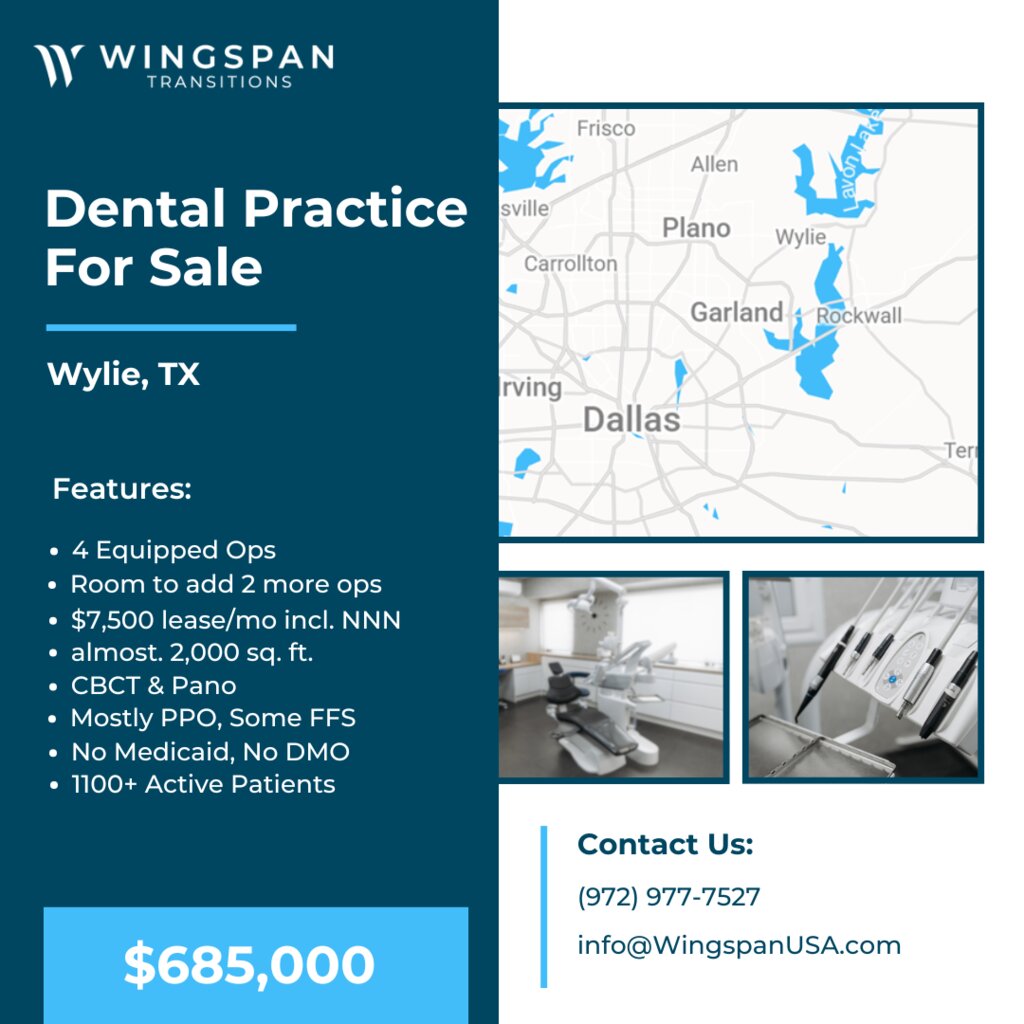 General Dental Practice – Wylie, Texas – FOR SALE – $685,000 – Located just 30 minutes northeast of Dallas in a growing area with over 17% observed growth and household income average of over $100K; office established for over 6 years, this general practice features 4 total equipped ops, plus room to add 2 more ops for a total of 6 ops. Almost 2,000 sq. ft. office located in a strip-center with good aesthetic appeal. Lease is $7,500/month, including NNN. Practice includes CBCT, Pano, Digital X-rays, Intraoral camera, and Open Dental software. The patient base is mostly PPO with some FFS, no DMO, no Medicaid and over 1,100+ active patients in the past 24 months. Our sellers require a signed NDA before we can share practice details. To get started, simply complete a Buyer Form and NDA at wingspantransitions.com/buyer-form. This only needs to be done once every six months. If you’ve already completed this within that timeframe, just email info@WingspanUSA.com or text us with your name and the listing you're interested in — we’ll verify your profile and NDA are active and send the details your way. Our goal is to respond within one business day. (Listing 1016-SC)