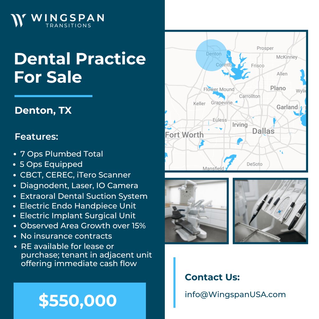 General Dental Practice – Denton, Texas – FOR SALE – $550,000 – Lease or purchase the real estate alongside the practice, located in a ~4,419 sq. ft. medical duplex. The practice occupies approximately 2,388 sq. ft. on one side, with an established tenant in the adjoining suite—providing immediate cash flow. Positioned in one of North Texas’ fastest-growing markets, this well-established 25+ year general dental practice offers a rare combination of advanced technology, strong patient demographics, and clear opportunity for growth. Located approximately 45 miles north of Dallas, the area continues to experience rapid growth with over 15% population increase and favorable dentist-to-patient ratios, creating an ideal environment for expansion. The practice features 5 fully equipped operatories and 7 total plumbed, allowing a new owner to step in and scale without delay. High-end technology including: CBCT, CEREC Omnicam with Milling Unit and Oven, iTero Scanner, 5 Mounted X-ray Units, Digital X-rays, DIAGNOdent, Diode Laser, Extraoral Dental Suction System (HEPA/UV) II, Electric Endodontic Handpiece Unit, Electric Implant Surgical Unit, Intraoral Camera, Dexis x-ray sensor, and Dentrix Practice Management Software. The office has not signed any contracts with dental insurance carriers; the patient base is 69% out-of-network PPO and 31% FFS/self-pay, with no Medicaid or DMO participation, offering strong fee autonomy and revenue control. The practice operates approximately 36 hours per week, leaving clear room to increase production. Denton’s demographic profile supports long-term stability and growth, with a population nearing 103,000, median age around 30, and low competition levels—ranking in the upper percentiles for patient-to-provider ratios. Strong 4.9-star Google reviews further reinforce the practice’s reputation and patient loyalty. This is an ideal opportunity for a buyer seeking a modern, technology-driven practice in a high-growth market with built-in expansion potential. Our sellers require a signed NDA before we can share practice details. To get started, simply complete a Buyer Form and NDA at wingspantransitions.com/buyer-form. This only needs to be done once every six months. If you’ve already completed this within that timeframe, just email info@WingspanUSA.com or text us with your name and the listing you're interested in — we’ll verify your profile and NDA are active and send the details your way. Our goal is to respond within one business day.