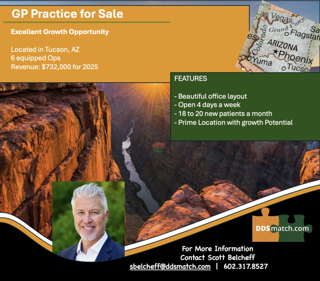 Well-established general dental practice located in Tucson, Arizona, now available for sale. Practice has a strong reputation for providing high-quality, patient-focused care with an emphasis on comprehensive dentistry and long-term relationships.