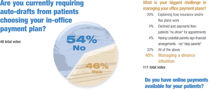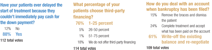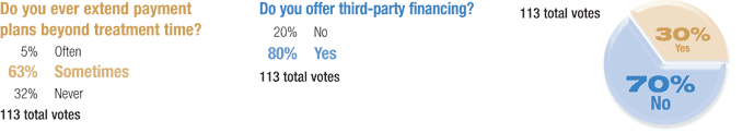 A successful patient financing program will result in a strong, consistent approval rate, cost effective practice fees and increased treatment acceptance. Find out how other Orthodontists handle their patient financing in this poll conducted from March 7, 2008 to May 2, 2008. Don’t forget to check out the current online poll about Post Treatment Management at Orthotown.com.