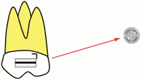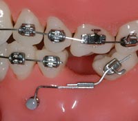Fig 3. Anchor head implant with direct anchorage mechanics.  Fig 4. Cross-slot implant with engaged wire segment for pre-prosthetic tooth movement using indirect anchorage.  Fig 5. TOMAS pin with attached auxiliary for molar uprighting (TOMAS uprighting spring). | Mini-implant Design It is accepted by now that a well-designed orthodontic mini-implant should have three parts to it: a shank, a collar and a head. The shank is the intra-osseous portion, which provides the retention in the bone. There are two different thread designs: self-drilling (drill-free) and self-tapping (non-drill-free); and two different basic shapes for the shank: cylindrical and conical. Again, both have advantages and disadvantages to them and the interested reader can obtain in-depth information from the recent literature.11-14 Here a more detailed discussion is not warranted. Suffice it to say that at this time, the self-drilling thread is the preferred design among orthodontic practitioners and the most advanced self-drilling shank designs are a combination of conical in the lower third and cylindrical in the top two-thirds, thus combining many of the advantages of both basic shank shapes. While the shank and the head can be found in every mini-implant, the collar is omitted in some designs, depending on the manufacturer. This is incomprehensible considering the importance of this part of the mini-implant. The collar represents the transgingival portion of the mini-implant. This is where soft tissue adaptation is meant to take place. Therefore the design of the collar should be solid (without perforation), smooth, highly polished and ideally conical — with the base of the collar having a smaller diameter than the top of the collar. This guarantees minimal compression and damage to the surrounding soft-tissues while immediate tissue adaptation can take place. A tight seal results and invasion of oral bacteria is kept to a minimum. A proper analogy for the fit of a conical collar in the insertion site, especially when used with a properly sized tissue punch, would be the fit of a cork in a wine bottle. The consequence is a very favorable healing environment, which might aid in increasing clinical success and patient comfort. Under all circumstances a multi-facetted collar should be avoided since this is an indication that the insertion instrument (such as the driver) attaches here. Such a design guarantees severe soft tissue trauma not only from the implant itself, but also from the driver. To avoid this, drivers should attach at the implant head. The shank provides the mechanical retention of the implant in the bone and the collar allows soft tissue adaptation — in other words, shank and collar influence biological parameters that may impact clinical success rates. The head design has little direct impact on survival of the orthodontic mini-implant. The head is the coupling site through which the implant is connected to the dentition. Therefore it is closely linked to the orthodontic biomechanics. The head design largely determines what type of anchorage (as explained above) can be installed and thus might indirectly influence where the implant needs to be placed. From the standpoint of clinical applicability, a versatile head design, which allows for a maximum of biomechanical options appears to be the most favorable design. Contemporary orthodontic mini implant head designs can be grouped into two major categories with multiple subgroups. The first category would be the so-called anchor-head mini-implants with or without eyelet. These allow only the attachment of elastic modules or steel ligatures (Fig 3). The second category are the so-called bracket head designs which are equipped with either a single or a cross slot and which allow, in addition to the attachment of elastic modules as described above, the ligation of a wire segment. This is vitally important should dependable indirect anchorage be desired (Fig 4). In addition a slot in the implant head creates compatibility with multiple different auxiliaries, which creates true biomechanical versatility (Fig 5). Two different options exist for wire ligation into a bracket head implant: ligature ligation and ligature-free ligation using composite. Ligature ligation requires either an eyelet or tie-wings. Ligature-free ligation using composite requires neither and thus the implant head can be smaller, lower profile and less contoured, allowing for better hygiene and providing greater patient comfort. In addition the composite connection is very rigid and fail-safe, providing truly dependable absolute anchorage while presenting with a smooth self-cleansing surface. This should be preferred over the eyelet version, which acts as a plaque trap or the high-profile tie-wing version. To date only one implant system is specifically designed for ligature-free ligation. |
