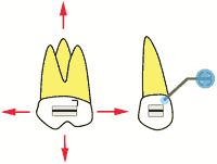 Fig 1. Direct anchorage resulting in "pulling" mechanics.  Fig 2. Indirect anchorage allowing more versatile tooth movement. | Anchorage Concepts Two anchorage concepts prevail. Initially, nearly all mini-implant case reports in the literature used the direct anchorage approach. Direct anchorage is a set-up in which a force is directly applied from the implant to a tooth or group of teeth that need to be moved. This means that when using direct anchorage, the tooth or group of teeth that are to be moved (target teeth) are pulled toward the implant: pulling mechanics result. The clinical consequence is that the type of tooth movement dictates where the implant needs to be placed. Protraction therefore requires placement of the mini-implant mesially to the target teeth, distalization requires placement distal to the target teeth, etc. (Fig 1). Over time, the indirect anchorage approach became increasingly popular. Here mini-implants are used to stabilize a group of teeth, creating an implanto-dental anchorage (IDA) unit. Then, target teeth are moved against this IDA. In this setup, implant placement is almost completely independent of the type of tooth movement desired and thus other important criteria will determine the actual implant site (Fig 2). Currently both anchorage approaches seem to be equally popular among clinicians. Both approaches have advantages and disadvantages to them and it is up to the treating orthodontist to choose the most appropriate approach for the specific situation at hand. The most important differences are the simple installation and the "hidden" force vectors associated with direct anchorage while indirect anchorage allows for use of traditional orthodontic mechanics with the difference that a group of teeth is "locked in" and will not move as a result of reciprocal forces. Indirect anchorage however is slightly more time consuming to install. |