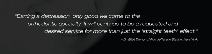 The current economic downturn has mixed responses from two orthodontists. "Barring a depression, only good will come to the orthodontic specialty," says Dr. Taynor. "It will continue to be a requested and desired service for more than just the 'straight teeth' effect." And Dr. Kelleher says, "Economic pressures and an aging population will likely diminish demand for orthodontic care, however people's vanity is as strong or stronger