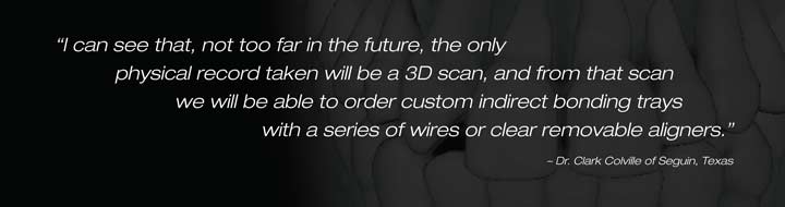 - And finally, Dr. Colville states, "I can see that, not too far in the future, the only physical record taken will be a 3D scan, and from that scan we will be able to order custom indirect bonding trays with a series of wires or clear removable aligners."