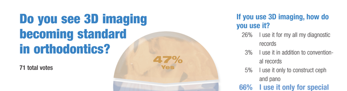 Find out what other orthodontists think about 3D imaging in this poll conducted from August 24, 2009 to October 6, 2009. Make sure to check out the current online poll at Orthotown.com.