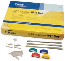 All components of the All Inclusive IPR Set were selected to provide better tactile control and enhance patient safety and comfort for when creating space between teeth during interproximal reduction. This set contains: four single-sided ortho strips in two grits, a perforated latch diamond disc, QwikStrips (curved) sample pack, (15) finishing strips in three grits, interproximal gauge for precise measurement and clinician's reference. For more information call 800-355-5063 or visit www.axisdental.com.