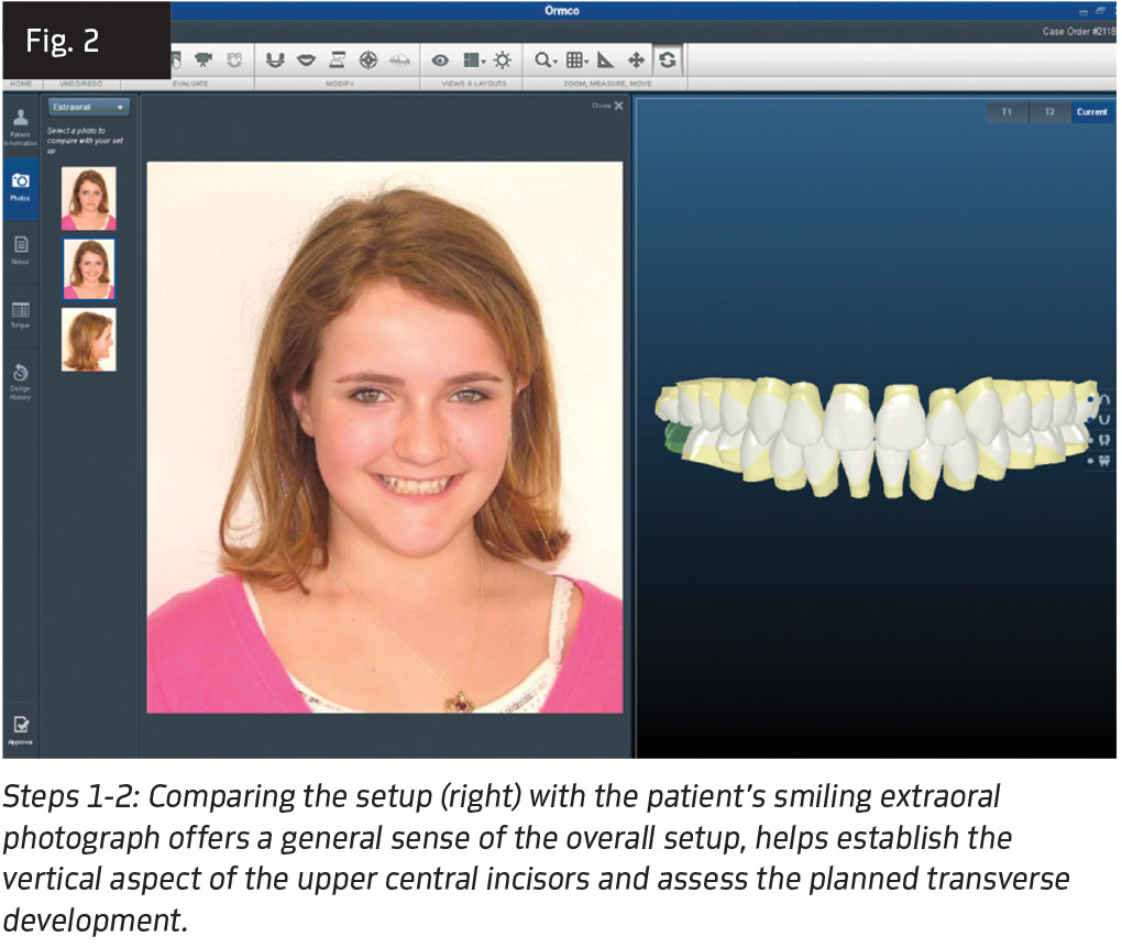 The first step, then, is to evaluate the smiling position of the upper central incisor side by side with the digital setup (Fig. 2). This allows me to ensure the bracket positions and planned mechanics do not lead to an unesthetic position of the upper incisor. Toggling between T1 (initial position) and T2 (final position) allows me to get a feel for the patient's smile and see if the upper incisors move as desired. The entire plan is built around the vertical positions of the upper central incisors. For this case, the vertical aspect of the upper centrals in the setup is spot-on.