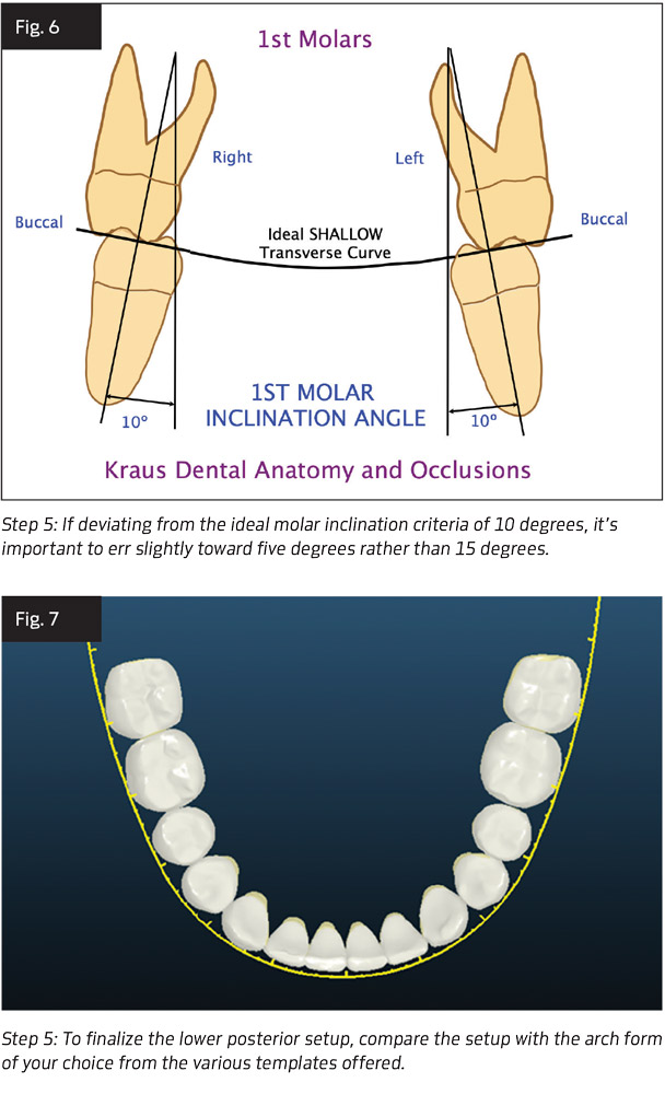 According to the Kraus Dental Anatomy and Occlusions,2 the ideal first molar axial inclination should be 10 degrees, which creates a slight Curve of Wilson (Fig. 6). If you need to deviate from this criterion, it's important to err slightly toward five degrees, rather than 15 degrees.