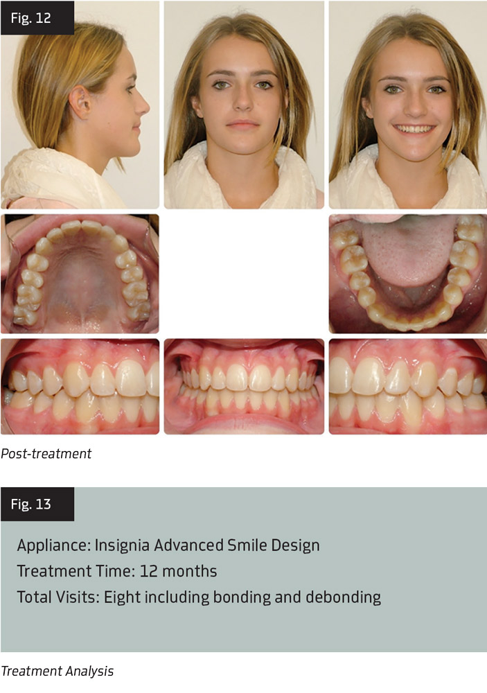 The Insignia Advanced Smile Design platform used in this case offered me sophisticated virtual treatment planning and custom-fabricated appliances—brackets, wires and positioning jigs—that resulted in superior clinical outcomes and greater treatment predictability and profitability for my practice (Fig. 13).