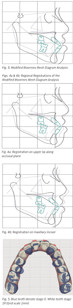 Given the major discrepancies between the mesh norm and the patient's tracing, "regional" registrations or superimpositions were more diagnostic in regard to the lower face (Figs. 4a & 4b).