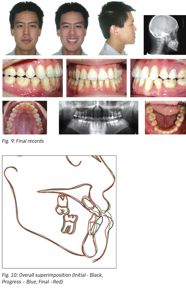 The treatment revealed an acceptable facial esthetic and good occlusion. Lateral cephalometric superimpositions (Fig. 10) demonstrate a reduction of the lower-lip prominence as a result of retroclination and retrusion of the mandibular incisors.
