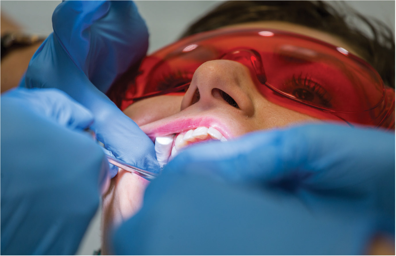 By the next appointment, four weeks later, the coil spring should have opened the space so that the interproximal surfaces are clearly visible. To prevent damage of gingival papillae during ARS, I suggest the placement of a brass wire between the tissue and the air-rotor stripping bur.