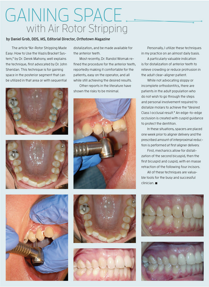 Many clinicians incorrectly associate air-rotor stripping (ARS) with the reduction of interproximal enamel in the mandibular incisor region. Interproximal reduction of the mandibular incisors, with a metal finishing strip, normally removes 1mm to 2mm of proximal enamel. Air-rotor stripping, on the other hand, can create 4mm to 8mm of arch space by reducing interdental enamel in the buccal segments.
