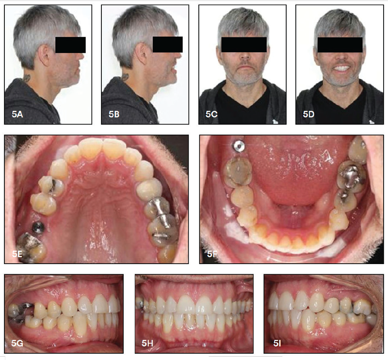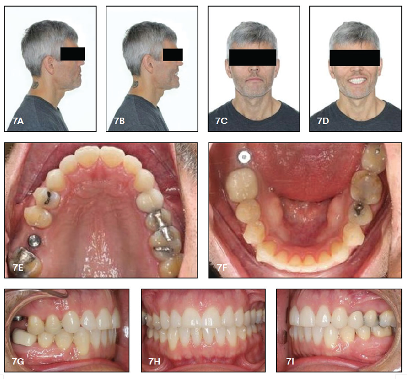 The patient’s final visit took place 10 months after the initial consult (Fig. 7), where he received crowns on top of the implants, following completion of the final set of aligner trays. We also fit him with upper and lower clear retainers for retention and stabilization at that last appointment.