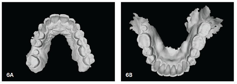 After the attachments were initially bonded and the 13 weeks of trays were completed, we performed a refinement scan using the 3Shape Trios Intraoral Scanner and delivered eight final aligner trays to finish and detail the case (Figs. 5 and 6).