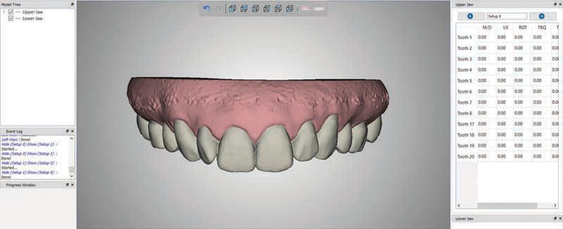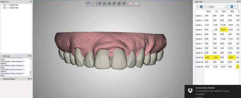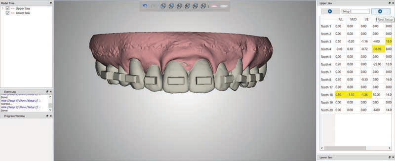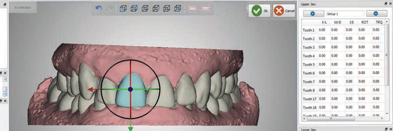Now that you have a shopping list and some background, let me walk you through the steps. I begin by positioning the central incisors relative to the face and smile in the software (Fig. 1, p. 35). This is what the patient will focus on and it allows me to have a landmark for the setup. I use the photos to determine the ideal position and the CBCT to ensure that the ideal placement is biologically feasible, then I correct the malocclusion in the software (Figs. 2 and 3, p. 35). I can align marginal ridges regardless of incisal wear and place the opposing cusps in the fossa. I make sure that my canines are symmetrically rotated and torqued. I do the same for my laterals and centrals—deciding whether to align the incisal edges or gingival zenith. I determine how much overbite and overjet are ideal for each tooth. On a patient with a Bolton’s discrepancy I can measure the amount of space I will leave for buildups or the amount of interproximal reduction required. This takes 3–5 minutes on the computer.