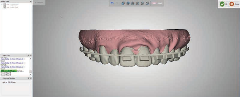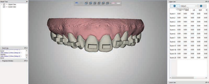 Once the bracket bases are positioned, I allow the software to return the teeth to their maloccluded positions and print them (Figs. 5 and 6). A vacuform tray is formed over the teeth, and the bracket bases and their spaces are removed from the tray.