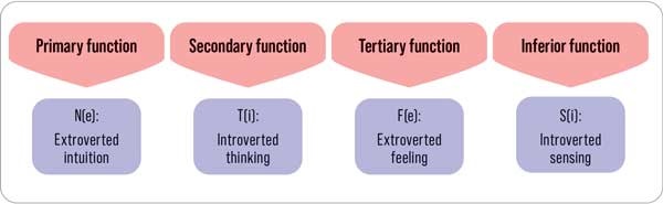 Each of the 16 personalities has four of the eight cognitive functions in a unique order. For example, my cognitive function stack, as an ENTP, is seen in Table 3. This implies that, as an extroverted intuitive, I prefer to be oriented toward the outer world in the form of curiosity, exploring possibility and connections between things. Because this is backed by introverted thinking (logic) as my secondary function, this takes the form of debating and challenging ideas to arrive at a logic-driven conclusion.