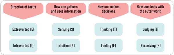 The 16 personalities of the MBTI are identified by a four-letter code, such as ENTP or ISFJ. The first letter pertains to direction of focus and will either be E or I, standing for extroverted or introverted. The second letter pertains to how one gathers information and will be either N or S, standing for intuitive or sensing. The third letter represents how one makes decisions and will be either T (thinking) or F (feeling), while the fourth letter stands for how one deals with the outer world and will be either P (perceiving) or J (judging). The full roundup is in Table 1.