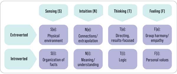 The four-letter combinations are codes to help determine one’s cognitive functions, as well as the order in which one relies on them. Cognitive functions are essentially mental processes involved in the acquisition of knowledge, manipulation of information and reasoning. There are eight possible cognitive functions, composed of extrovert and introvert versions of the four possible middle letters: S, N, T and F (Table 2).