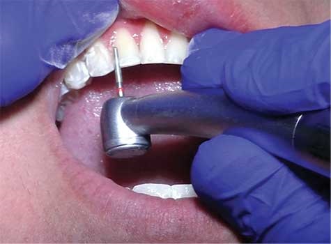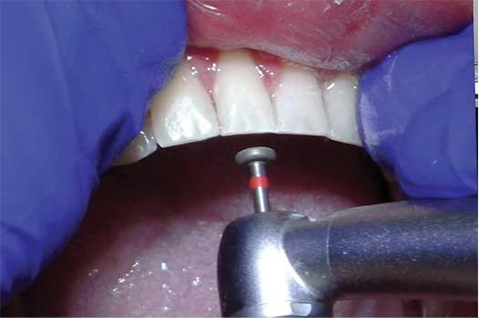 1. The flat, red fine diamond wheel bur is used to smooth lingual incisal and incisal edges of lower anteriors and round lower cuspids and bicuspids as needed (Fig. 4). This is done dry, and at a stall-out speed to not heat up the tooth or cause excess sensitivity.