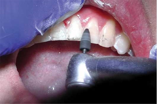 3. The black rubber-point tip is used on a high speed to polish the enamel on each tooth (Fig. 7). This is again done dry at a stallout speed. This bur will put an impressive shine on the enamel that will reflect light beautifully. This bur is used without pushing too hard on the enamel, and is used repeatedly until the tooth appears shiny.
