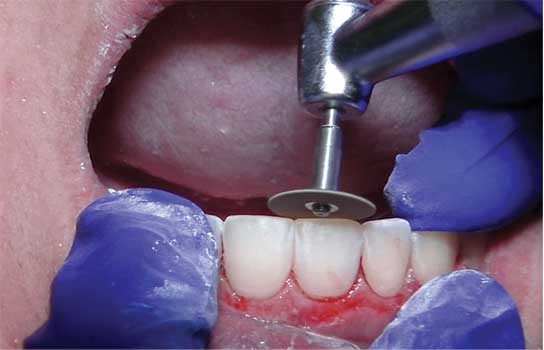 6. Finally, the diamond-impregnated fine diamond disc is used for embrasures and lingual surfaces (Fig. 9). This is done with extra fulcrum and caution, because this disc can remove enamel easily. Embrasures are created, increasing in size from central to lateral, lateral to cuspid, etc. We look from all angles to remove any sharp edges or discrepancies.