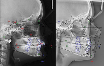 Evaluating the final records from outside-in, there were some noticeable facial changes worth noting. On profile, her lower one-third facial height increased (Figure 4) by way of clockwise rotation of her mandible (the SN-GoGN was increased from 16 to 24, shown in Figure 5). That vertical gain also permitted some other important esthetic improvements.