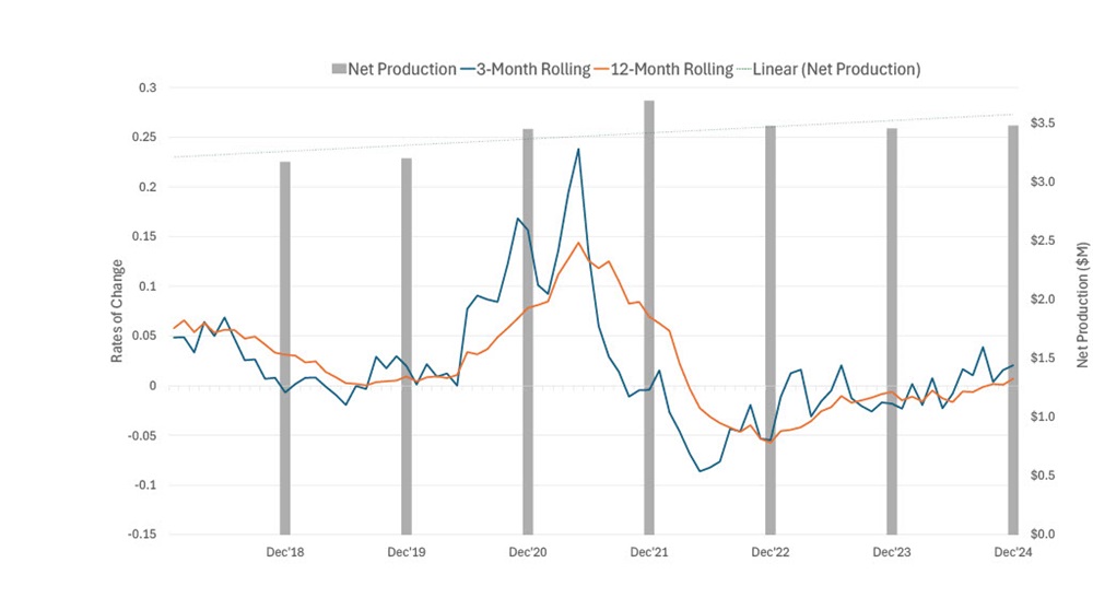 After years of fluctuation, production finished strong, with growth trending up since July—the first sustained improvement since 2021. Despite one fewer workday and the leap year’s calendar shifts, the back half of the year saw growth in four of six months—a welcome sign of stability.