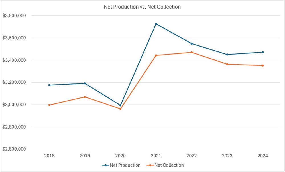 Net production should be 5%–20% greater than net collection to indicate a growing practice. Net collection consistently being higher than net production usually indicates no growth or a practice in decline. Recognizing this trend early helps prevent overlooked financial risks.