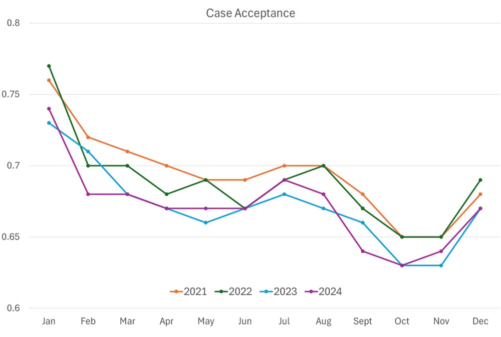 Case acceptance has declined year over year, but seasonal trends remain consistent. Rates are higher from January to March and lower from September to November (Fig. 6).