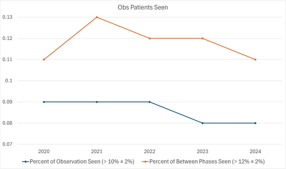 Observation visits dropped from 9% (2020–2022) to 8% (2023–2024), pointing to lower engagement in pre-treatment and between-phase monitoring (Fig. 7).