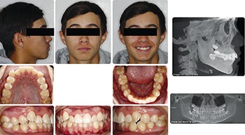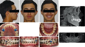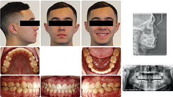 The second case is a 17-year-old male. Despite the crowding and protrusion, I felt that non-extraction treatment had a reasonably good chance of success. I initially flipped his upper incisor brackets in anticipation of needing negative torque. However, the progress records from the pan/repo/ceph appointment at seven months revealed to me that continuing with the non-extraction plan in my hands was not prudent. I did not feel confident that, even with the prospect of safely pushing the limits of IPR and negative torque, I would be able to position his upper incisors in an ideal AP and labiolingual position. The decision was made at that appointment to un-flip (reposition) the upper incisor brackets and refer for the extraction of his upper first bicuspids and lower second bicuspids. The treatment was completed in 25 months, resulting in a favorable position of his upper incisors within his face and smile.