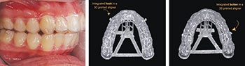 Several aligner systems now offer streamlined options for integrated elastic wear. Examples include the Angel Aligner’s angelButton and Spark Aligners’ integrated hooks. More recently, with direct-print aligners, elastic buttons and hooks have been integrated directly into the printed aligner itself, further expanding clinical versatility (Figs. 2 and 3).