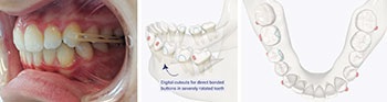 Fig. 4: Examples of direct bond buttons used to correct sagittal discrepancies in a lingual braces’ patient and to de-rotate posterior teeth with clear aligners.