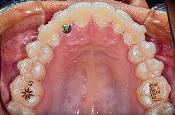 Bootstrap elastics are a common method for extruding teeth. In these cases, direct bond buttons are preferred, as they allow targeted vertical force and facilitate the tooth’s movement into the aligner shell (Fig. 5). Similarly, bonded buttons are useful for occlusal settling, functioning much like settling elastics used with traditional braces.